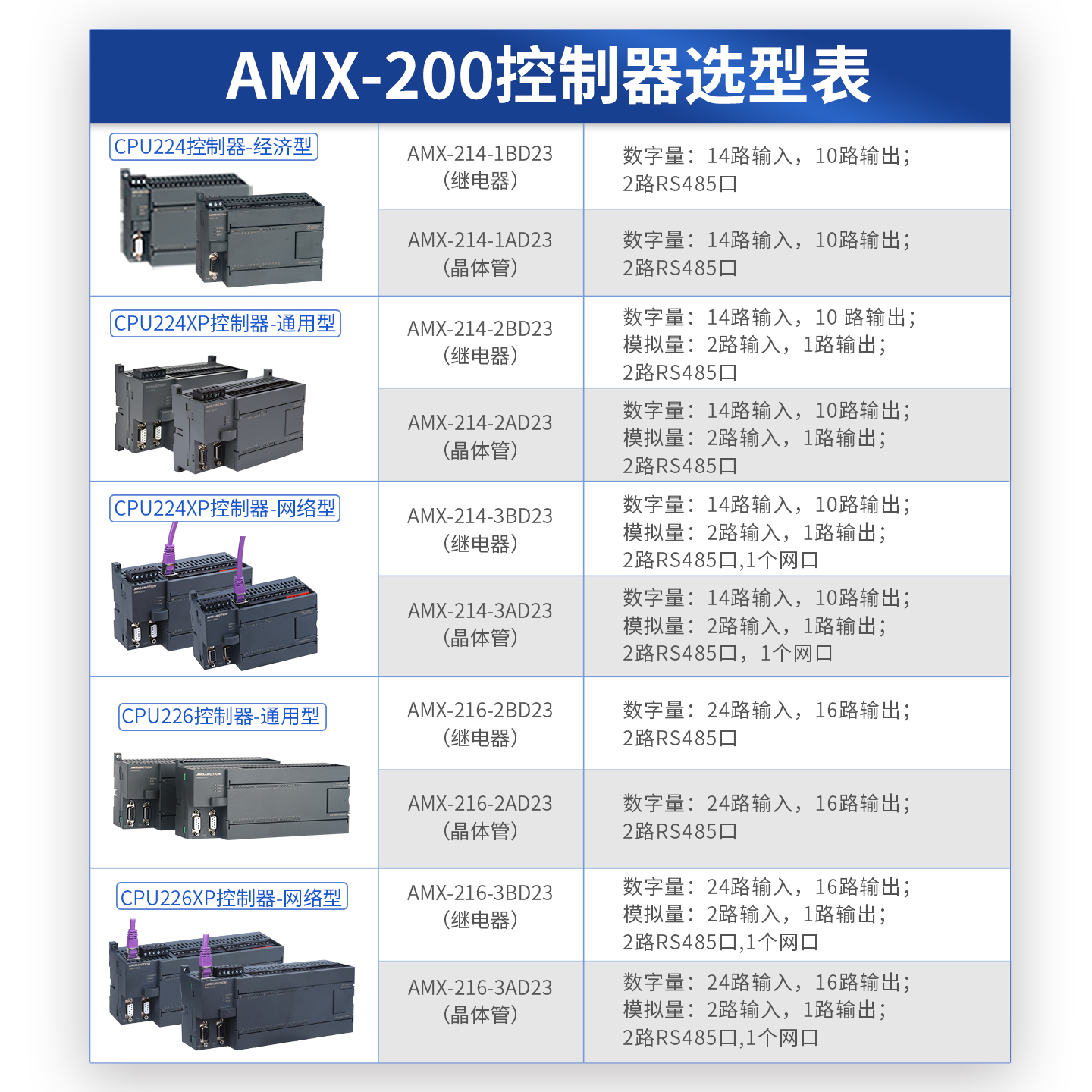 艾莫迅 AMX-200 系列是兼容 S7-200 ,分 224/226 两型,支持 DC24V/AC220V 供电。配备双 RS485,可选以太网,支持 MODBUS、S7 通信,可扩展 7 个模块,兼容数字量、模拟量、热电阻扩展。掉电免电池保存,时钟续航久,抗干扰强。
