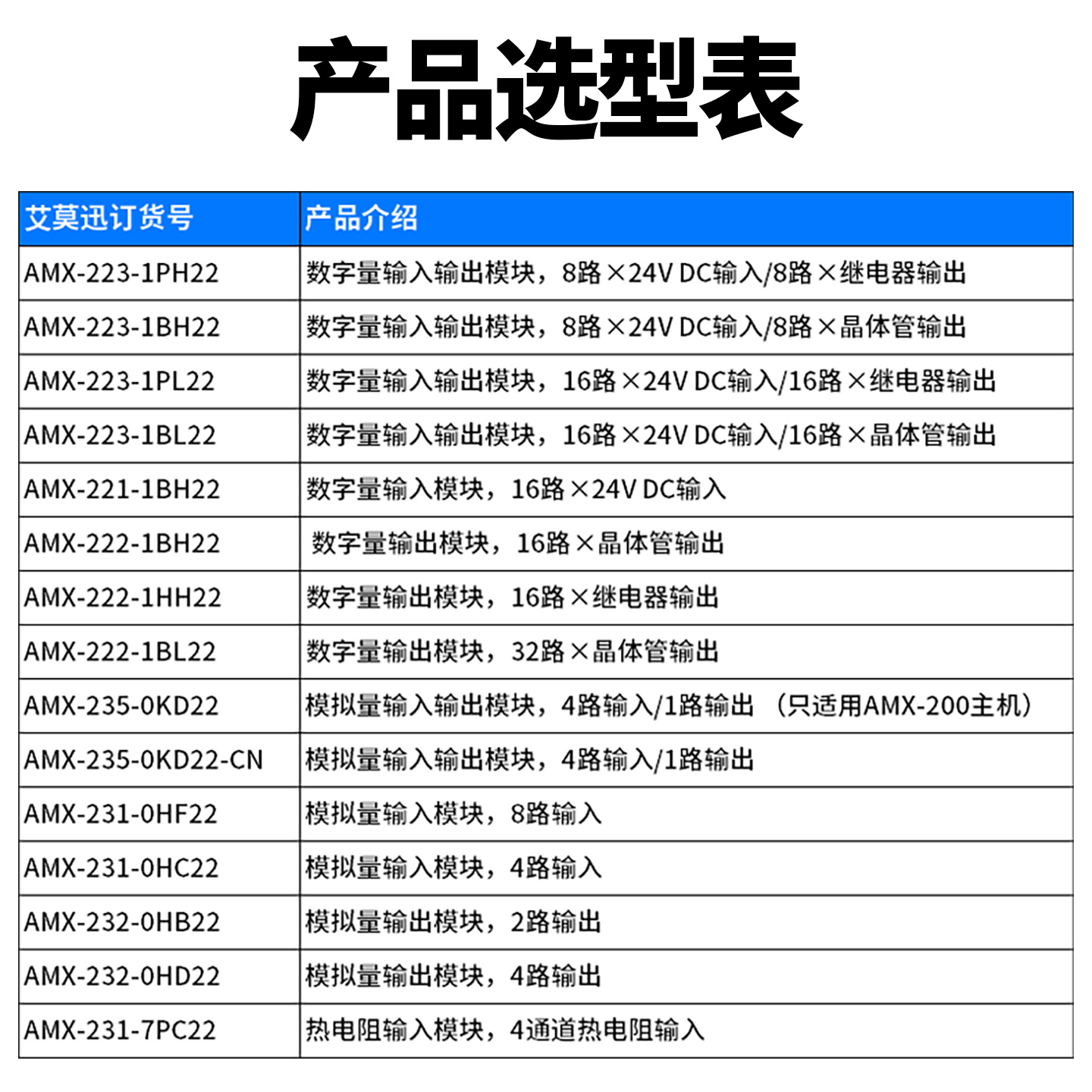 AMX-200 扩展模块,型号丰富,支持数字量输入输出、模拟量采集、温度采集等模块,最多扩展 7 个,灵活满足点数扩容需求。支持 PT100 热电阻、电压 / 电流模拟量信号,接线简便、配置直观,可兼容原装主机。