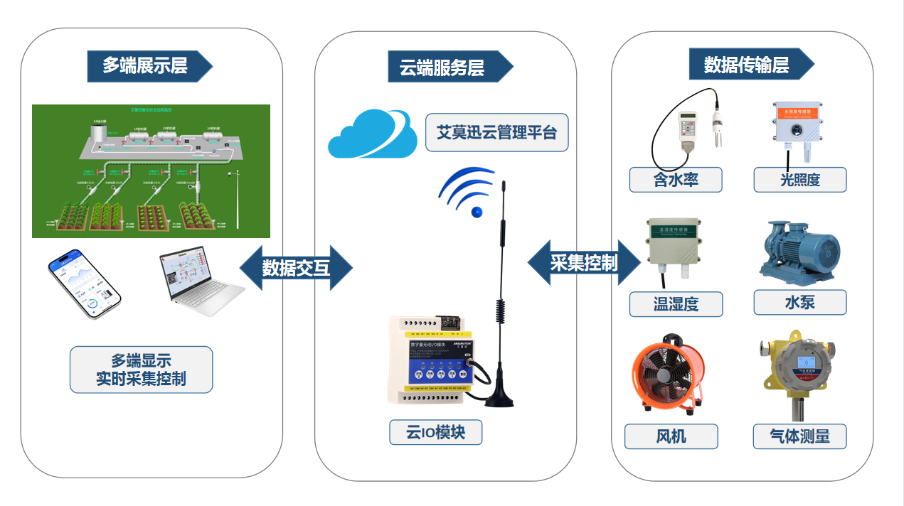 可以采用艾莫迅 4G 云 IO 远程控制模块,通过4G 全网通联网,将现场水泵、风机、电磁阀、遮阳电机、传感器等接入模块。