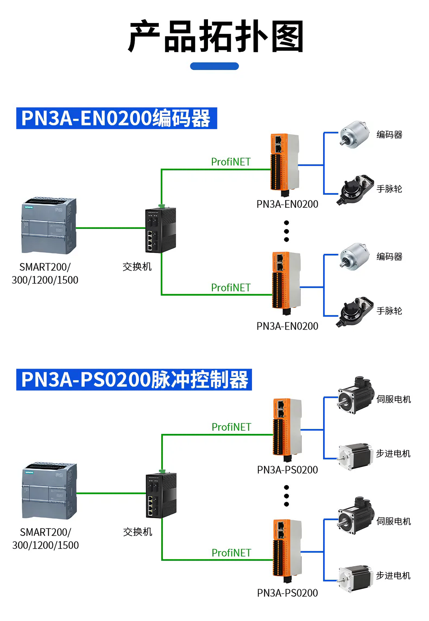 PN3A-PS0200(Profinet协议)、EC3A-PS0200(EtherCAT协议)是一款双通道差分脉冲定位模块,该模块拥有两个脉冲定位通道、16 路输入通道以及 4 路数字输出通道。