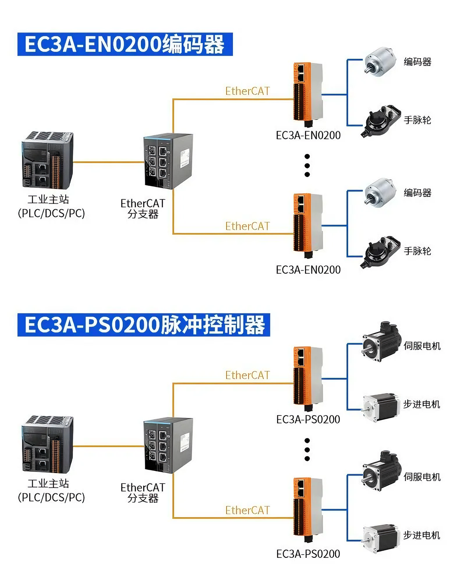 PN3A-EN0200(Profinet协议)、EC3A-EN0200(EtherCAT协议)是一款双通道差分编码器计数模块,该模块拥有两个编码器通道、6 个数字输入通道以及 6 个数字输出通道。