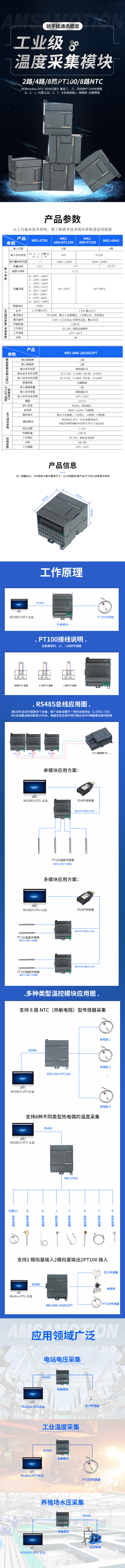 MR2-AT8G 为 8 路热电偶温度采集模块,搭载 RS485 接口与 MODBUS-RTU 协议,兼容多类型热电偶。模块具备电气隔离防护、高精度测温能力,支持多量程温度检测,采用导轨安装设计,适配各类工业自动化场景,可无缝对接 PLC 及组态上位机,实现多通道稳定温度采集与远程数据传输。