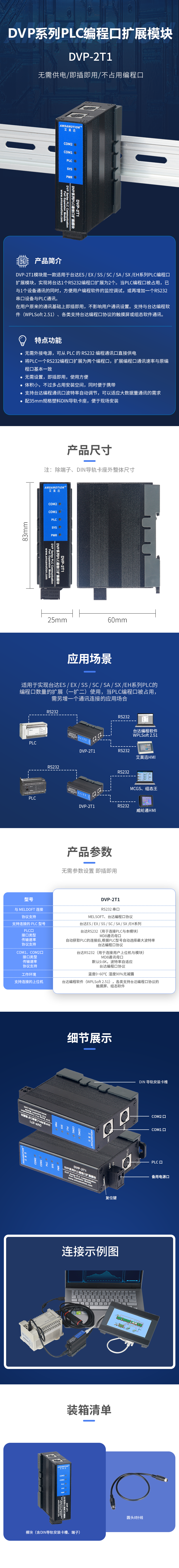DVP-2T1 为适配台达 DVP 全系列 PLC 的工业级串口拓展模块,实现原生 RS232 编程端口一分二扩容。产品无需参数设置,兼容原有通讯协议与接线规范,可并行接入调试终端、触控屏等外设。具备宽压供电与状态指示灯,结构紧凑安装便捷。