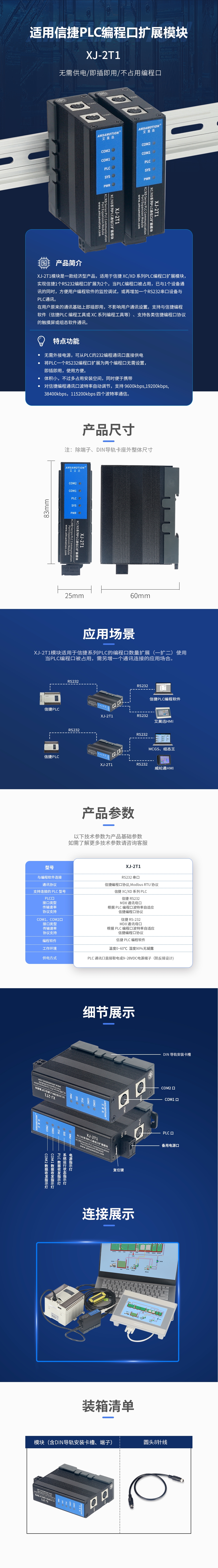 XJ-2T1 为适配信捷 XC/XD 系列 PLC 的 RS232 编程口扩展装置,实现单通讯端口双路拓展。设备无需参数配置,自适应主流通讯速率,兼容多重供电模式。集成运行状态指示,结构紧凑便于柜体导轨安装。